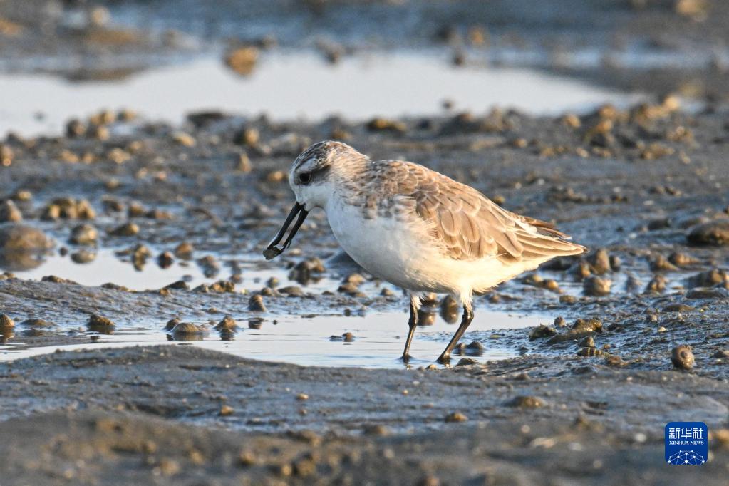 世界珍稀鳥類勺嘴鷸在海南儋州灣濕地覓食(2022年12月11日攝)。