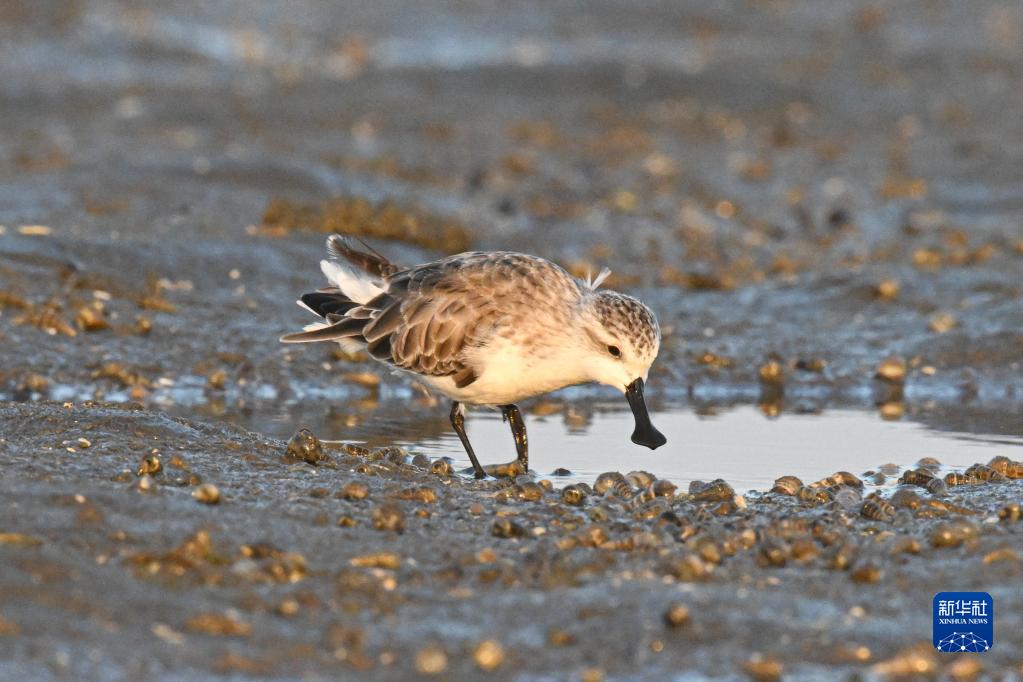 世界珍稀鳥類勺嘴鷸在海南儋州灣濕地覓食(2022年12月11日攝)。