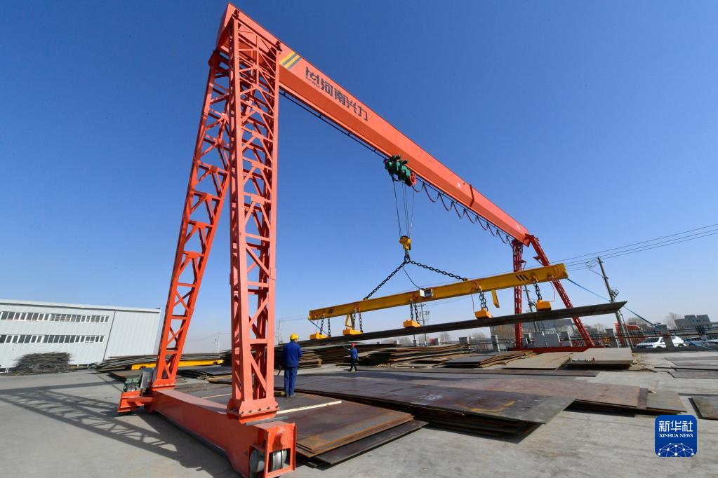 2月2日,在張掖市高臺縣的一家風機塔筒企業,工人使用龍門吊車吊運鋼板。