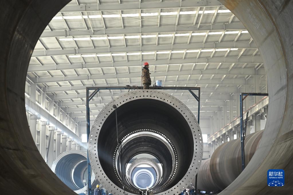 2月2日,在張掖市高臺縣的一家風機塔筒企業,工人在生產線上作業。