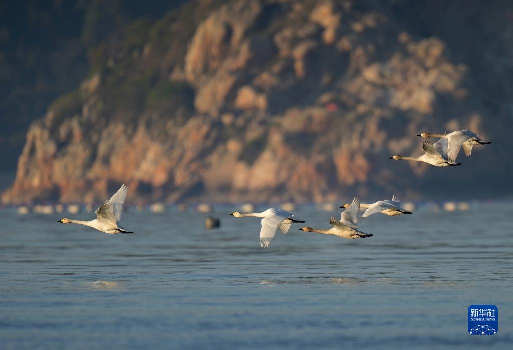 一群天鵝飛過閩江河口濕地上空(1月31日攝)。