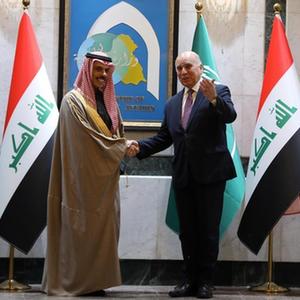 2月2日,在伊拉克首都巴格達,伊拉克外交部長侯賽因(右)與到訪的沙特外交大臣費薩爾在舉行聯合記者會前握手。