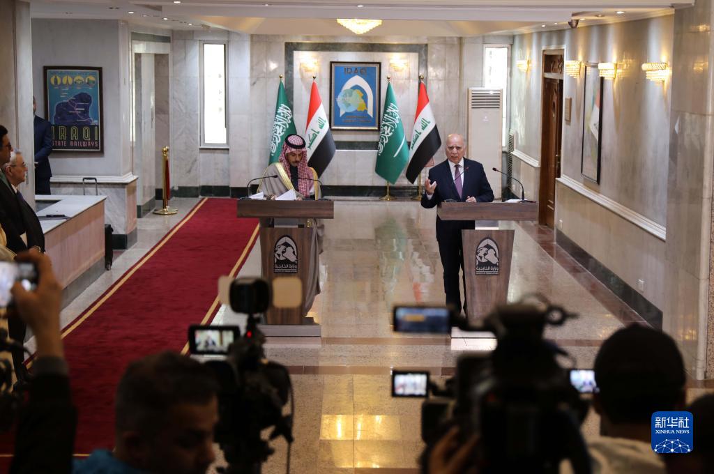 2月2日,在伊拉克首都巴格達,伊拉克外交部長侯賽因(右)與到訪的沙特外交大臣費薩爾舉行聯合記者會。