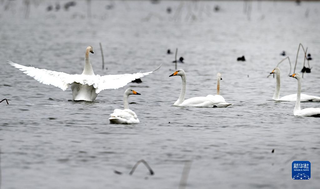 2月2日,一群白天鵝在陜西省合陽縣黃河濕地嬉戲覓食。