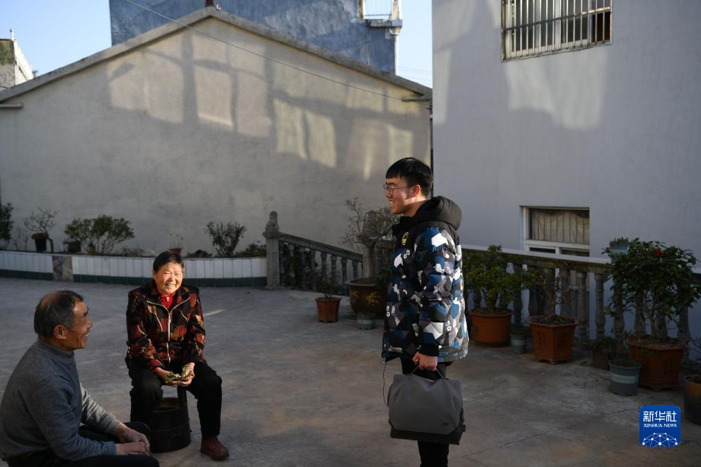 1月31日,郭昊(右)在安徽省六安市舒城縣湯池鎮與當地村民交流。