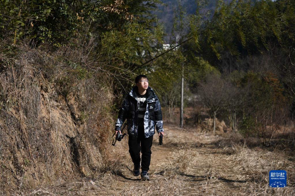 1月30日,郭昊走在安徽省六安市舒城縣湯池鎮的山路上準備進行無人機航拍。