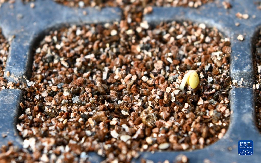 這是2月2日在天津市農業科學院創新基地大棚內拍攝的一株剛剛破土發芽的花椰菜試驗種。