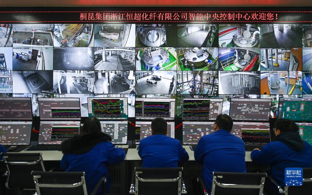 位于桐鄉市洲泉鎮工業園區的桐昆集團浙江恒超化纖有限公司的智控中心內,工作人員在查看各條生產線的運行情況(2月2日攝)。春節期間,該公司的生產設備全負荷運轉,1000多名職工堅守在生產一線,全力沖刺一季度“開門紅”。