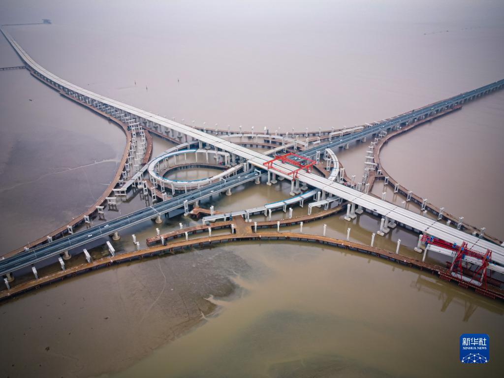 杭甬高速復線一期工程濱?;ネ⒔粯蚪ㄔO現場(2月1日攝,無人機照片)。杭甬高速復線一期工程全長55.833公里。