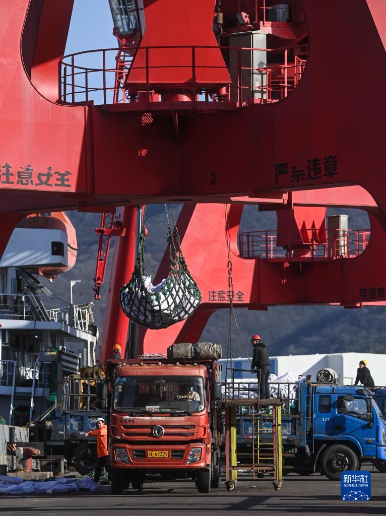 工人在舟山遠洋漁業基地的碼頭上卸貨(1月31日攝)。舟山遠洋漁業基地2022年遠洋自捕魚進關量達62萬噸,2016-2022年累計近278萬噸。