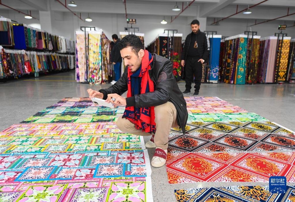 2月3日,在紹興柯橋,也門人阿珂拉姆通過手機視頻向中東的客商介紹布樣。