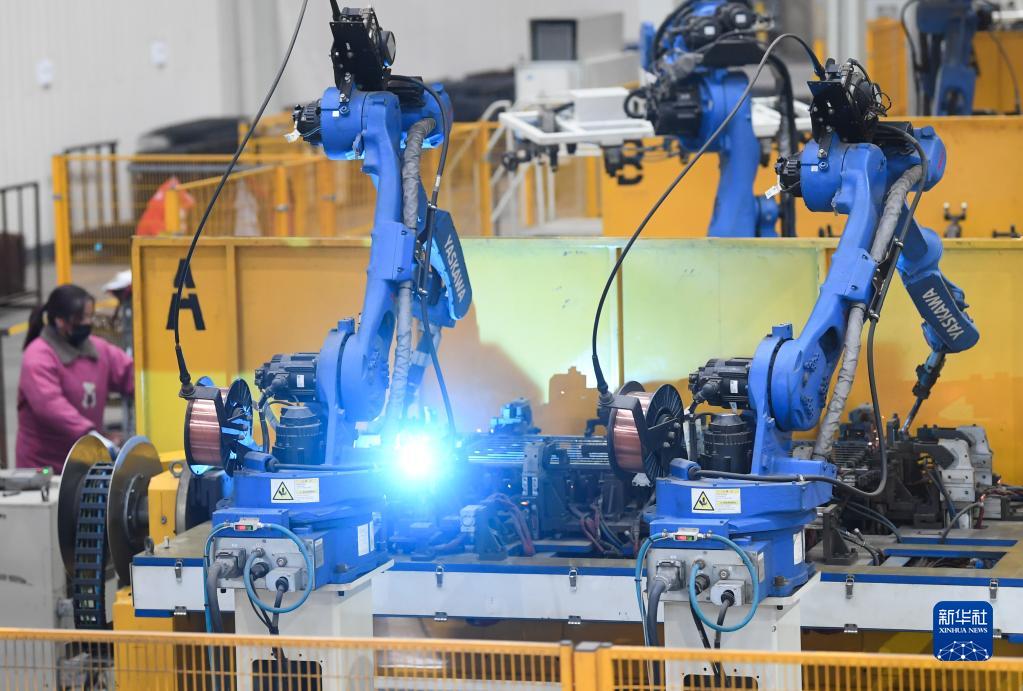 在位于臺州臨海的浙江正特股份有限公司,智能機器人在自動焊接生產線上工作(2月2日攝)。