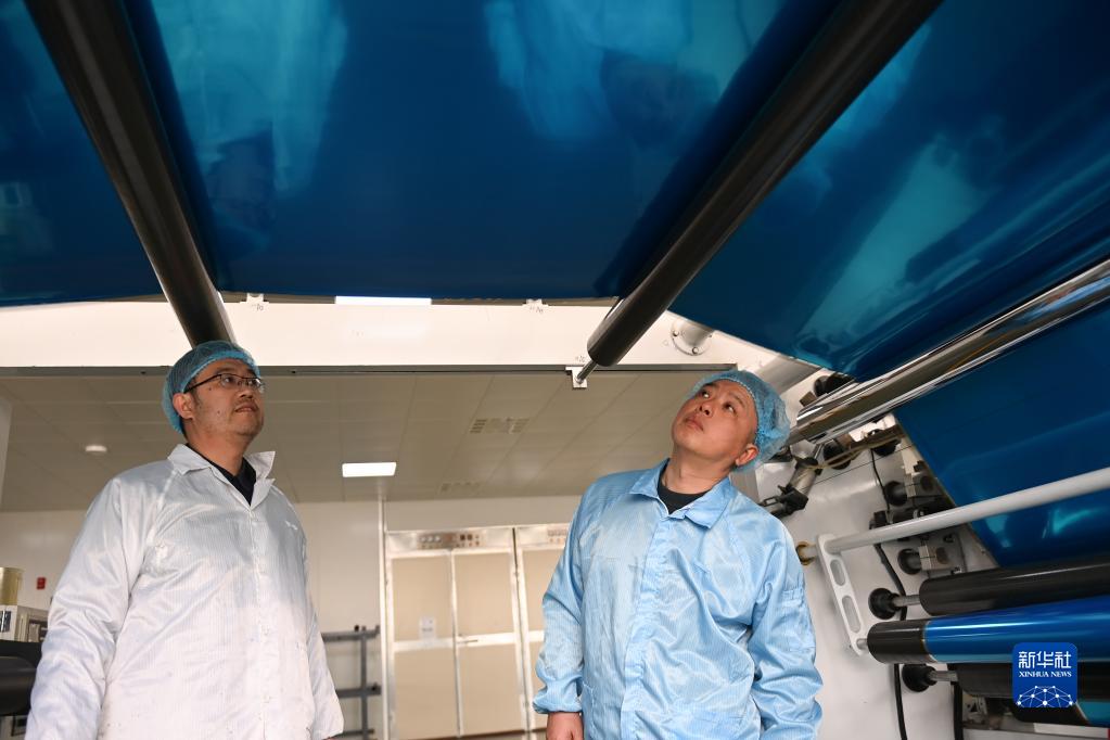 工人在寧波瑞凌新能源科技有限公司的降溫薄膜自動化生產車間監測設備運行(2月1日攝)。