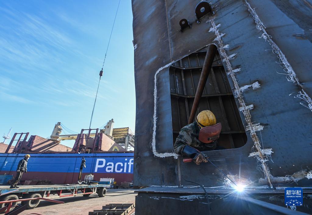 萬邦船舶重工(舟山)有限公司的工作人員正在進行電焊作業(1月31日攝)。春節期間,位于舟山市普陀區小干島的萬邦船舶重工(舟山)有限公司的沿海岸線碼頭上排滿等待修理的船舶,一臺臺高空作業平臺車環繞著萬噸巨輪加緊運轉作業,一季度訂單已經全部排滿。