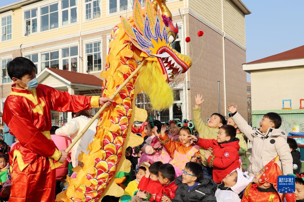 2月3日,山東省青島西海岸新區第一幼兒園小朋友觀看舞龍表演。