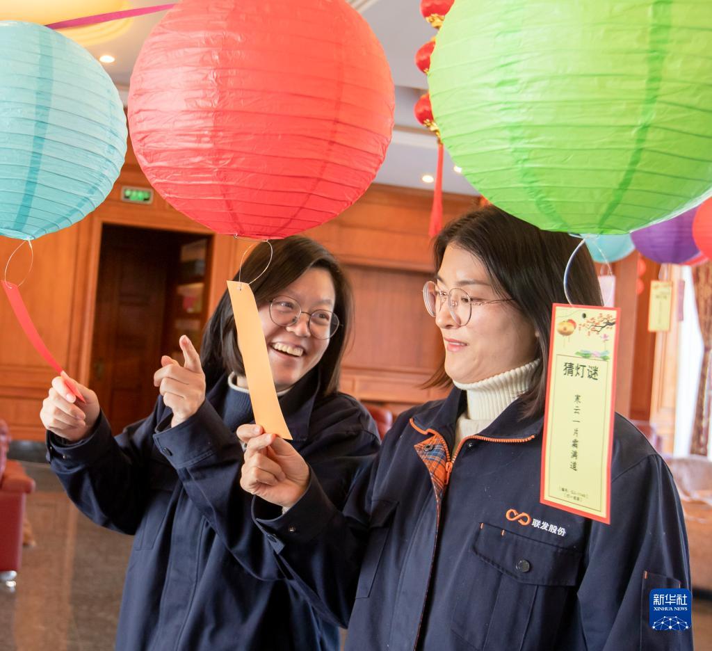 2月3日,江蘇省海安經濟技術開發區一家公司的員工在進行猜燈謎活動。