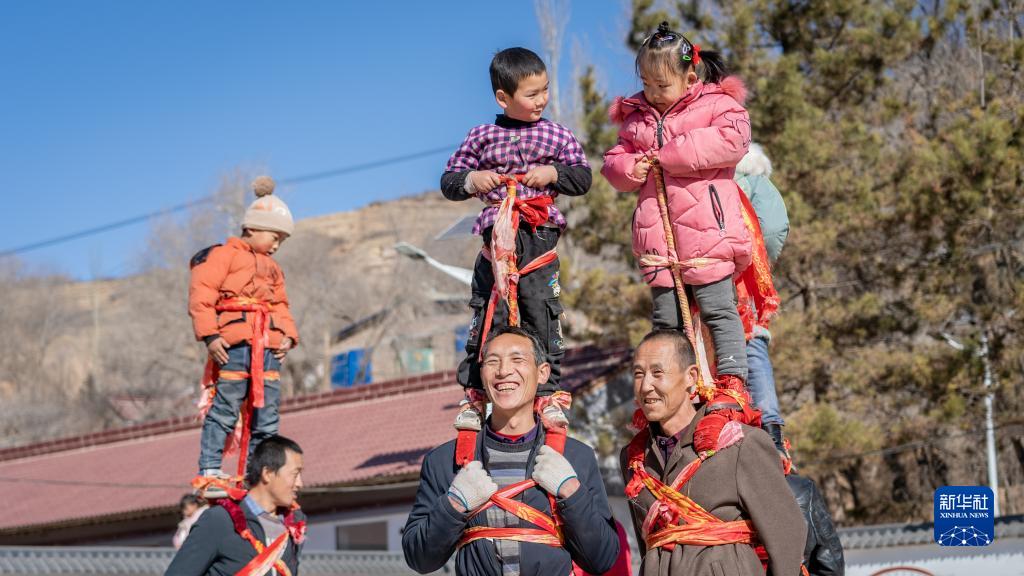 2月3日,寧夏固原市隆德縣觀莊鄉陽洼村村民在排練扛社火??干缁鹗怯缮韽娏训某赡昴凶蛹缈钙鹉挲g較小的孩子,扮演成各種不同的戲曲人物,在行走中進行表演,是社火演出的一種形式。