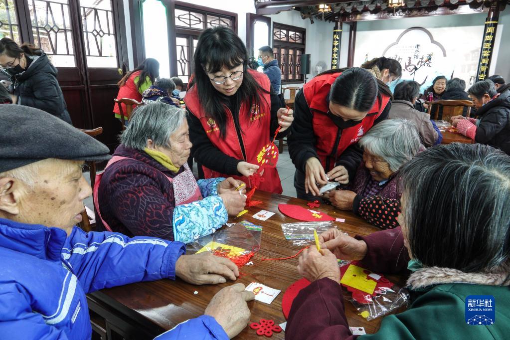歇馬橋村志愿者輔助村里的老人做元宵節燈籠(2月2日攝)。該村通過古村落保護與村莊環境整治工作,建設成為長三角鄉村文化傳承創新典型村落。
