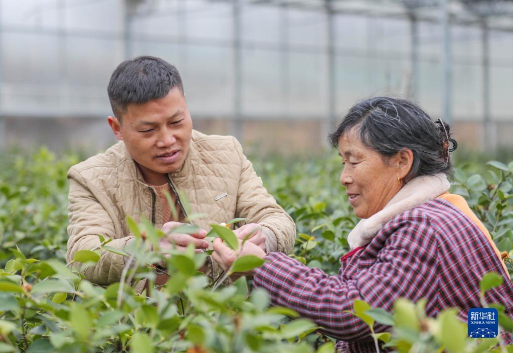 2月3日,技術人員(左)在貴州玉屏侗族自治縣油茶育苗中心對工人進行技術指導。