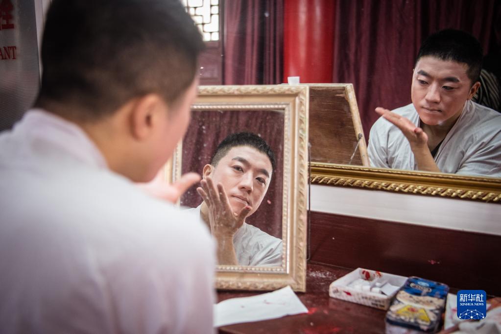 2月3日,武漢楚劇院演員在后臺做準備。