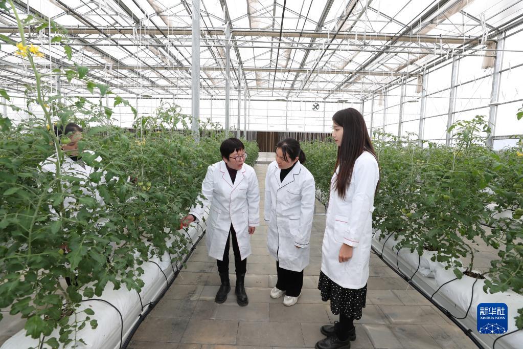 2月3日,在福州市蔬菜科學研究所種植大棚,所長陳秀娟(右三)與團隊科研人員討論廢菌包在蔬菜無土栽培中的應用技術。