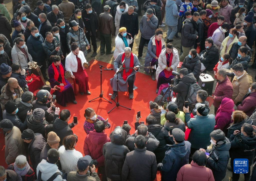 當日是正月十三,時隔三年,河南省寶豐縣馬街書會線下“重啟”。來自全國各地的說書藝人負鼓攜琴,聚集于此。在麥田中,他們以天作幕,以地為臺,說書會友,彈唱獻藝。
