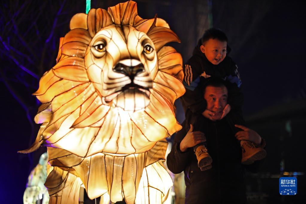2月3日,一位小朋友和家長在營口遼河老街的獅子花燈前拍照留念。