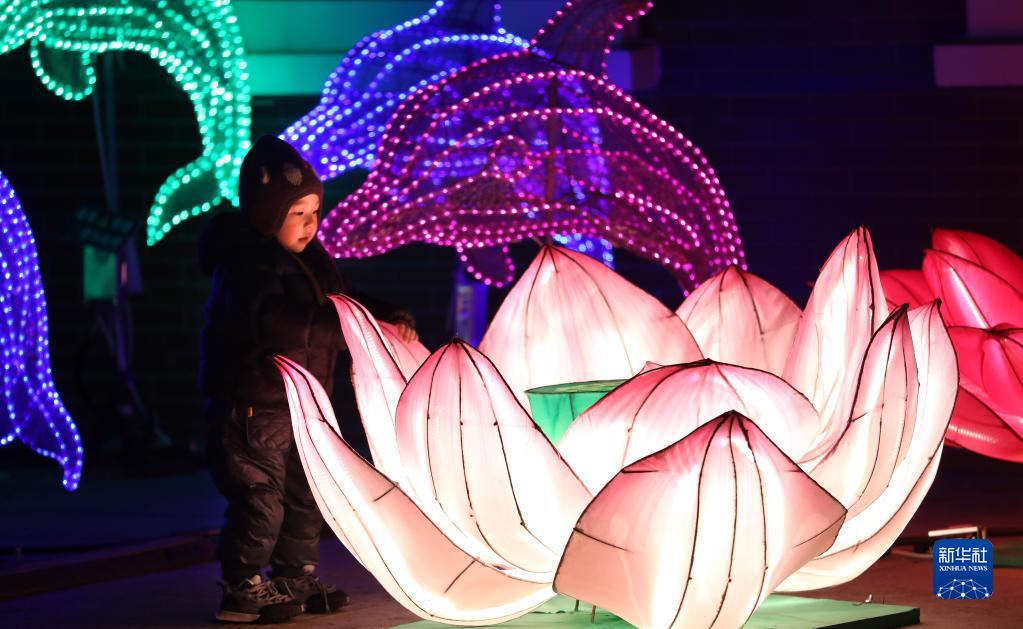 2月3日,一位小朋友在營口遼河老街的蓮花形花燈前游玩。