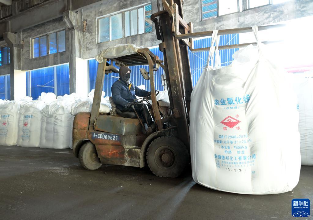 2月3日,在淮南市一家化工有限公司,工人駕駛叉車搬運化肥。