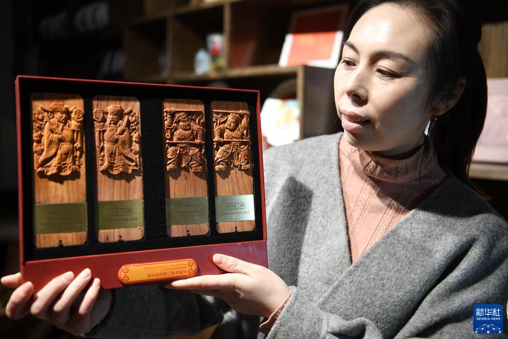 2月3日,武強年畫博物館工作人員展示一款武強木版年畫文創產品。