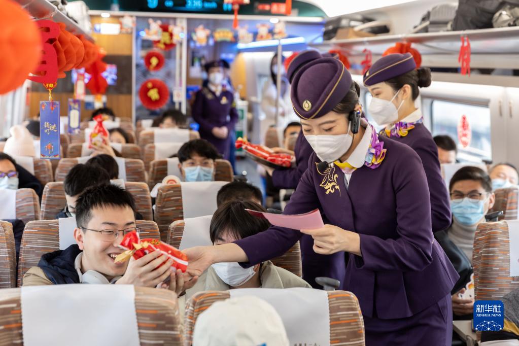 2月4日,鐵路上??瓦\段乘務人員在G8次列車上為猜燈謎的旅客送上小禮品。
