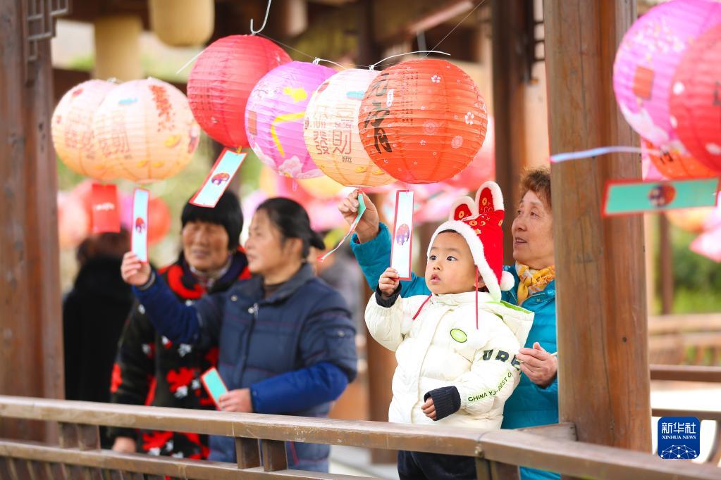 2月4日,在浙江省湖州市德清縣鐘管鎮,村民和游客在猜燈謎。