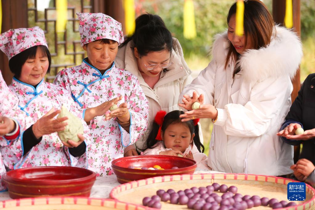 2月4日,在浙江省湖州市德清縣鐘管鎮,村民和游客在包湯圓。