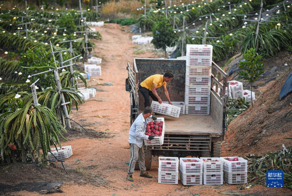在海南省三亞市育才生態區“水果島”火龍果基地,人們將采收的火龍果裝車(2月1日攝)。