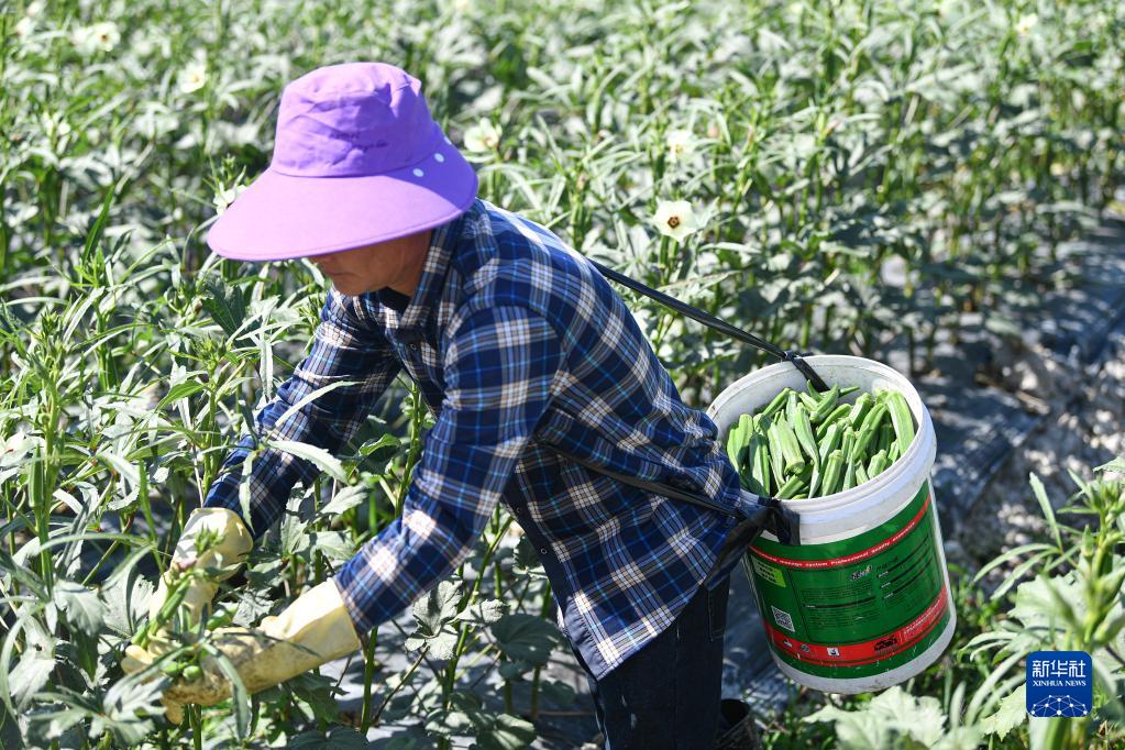 農民在海南省三亞市天涯區的農田采收秋葵(2月1日攝)。