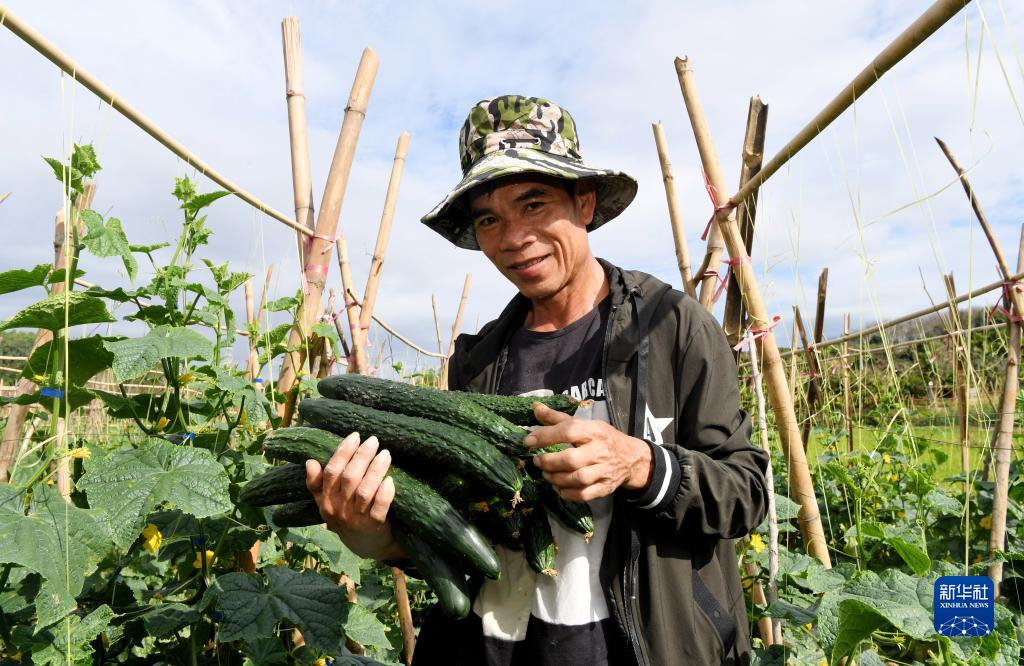 海南省三亞市育才生態區那受村農戶董政強展示剛采摘的青瓜(2月2日攝)。