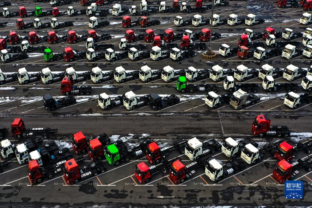 這是1月31日在吉林長春拍攝的一汽解放智慧物流公司整車物流部停車場內即將轉運交付的車輛(無人機照片)。