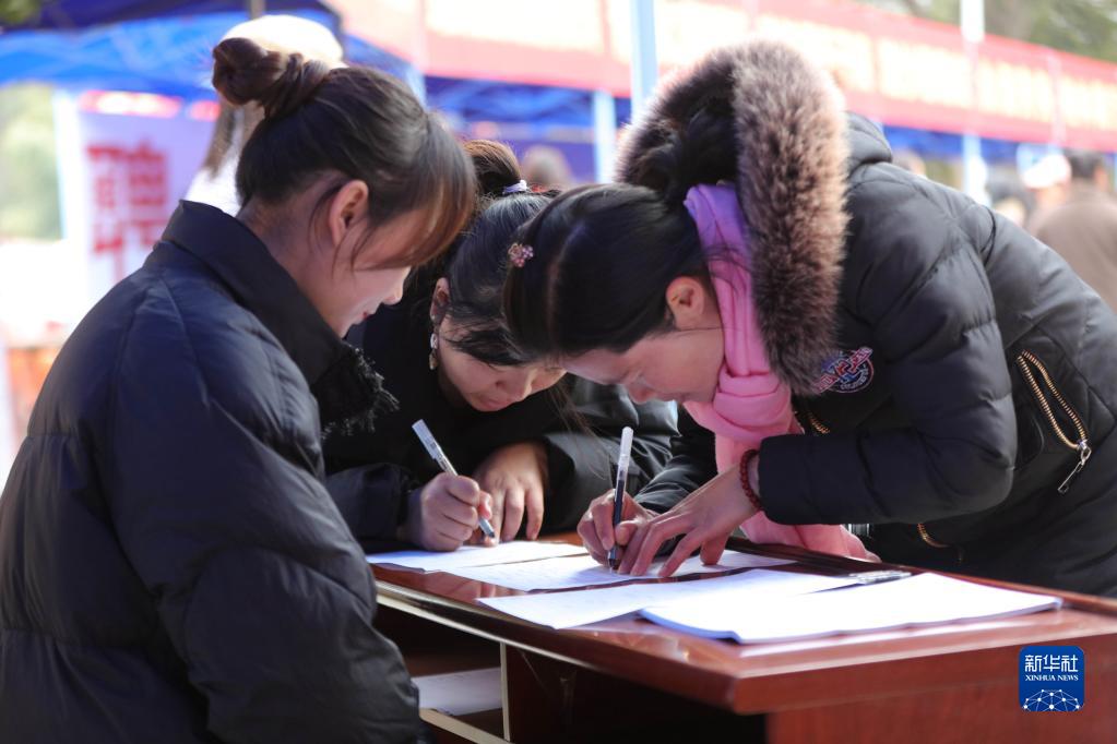 2月4日,在湖南張家界市武陵源區協合鄉舉行的“春風送暖”農村用工招聘會上,村民填寫崗位就業申請。當地20多家企業提供采茶工、廚師、講解員、酒店服務員等500多個就業崗位,幫助更多農村群眾實現家門口就業。