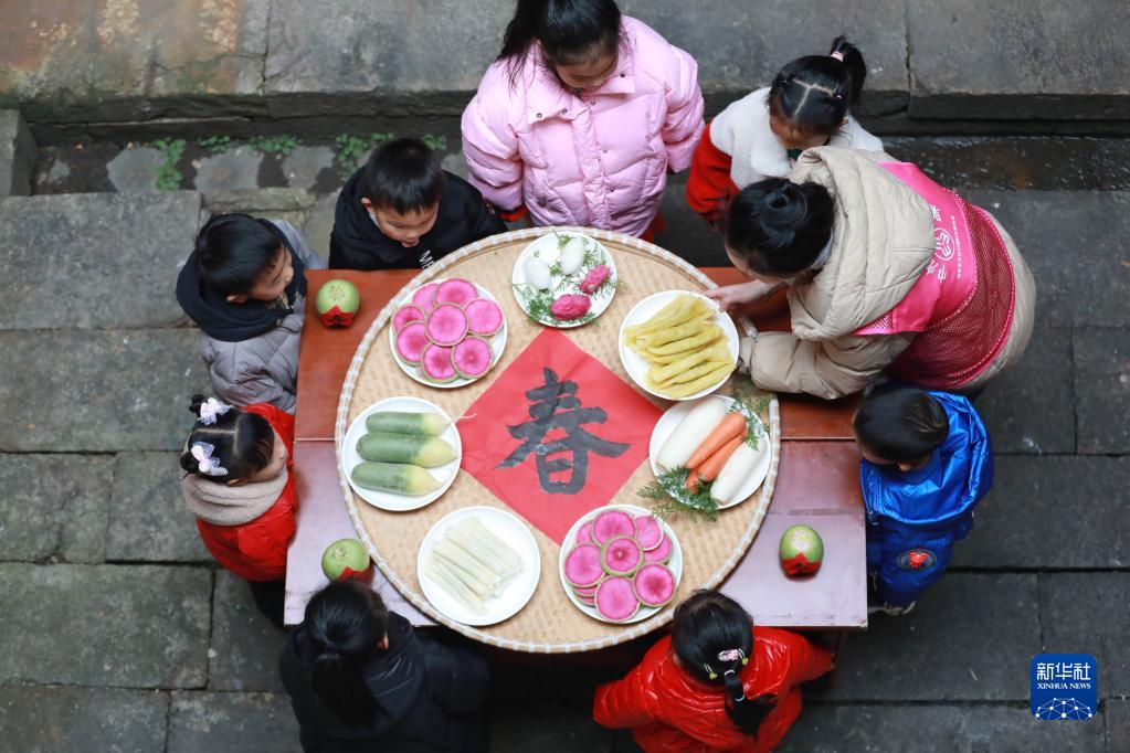 2月4日,在浙江省杭州市臨安區天目山鎮交口村文化禮堂,小朋友在學習立春“咬春”民俗知識。