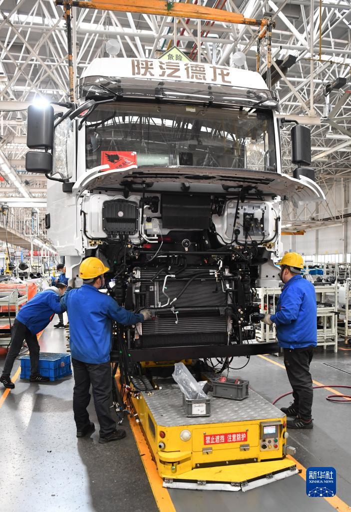 2月2日,工人在陜汽控股集團重卡總裝車間裝配卡車。