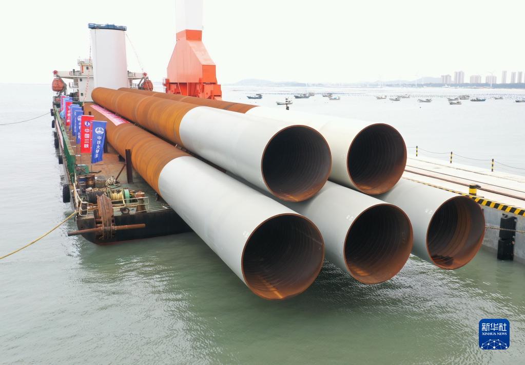 這是運往三峽集團福建漳浦六鰲海上風電場二期項目點安裝的管樁(2月4日攝,無人機照片)。
