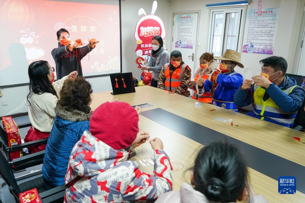2月4日,在中建三局浙江公司南京華貿中心項目部,工人和南京市鼓樓區工人新村社區居民學習制作中國結。