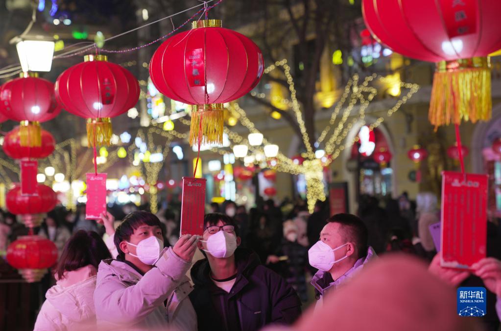 2月4日,游客和市民在黑龍江哈爾濱中央大街上猜燈謎。