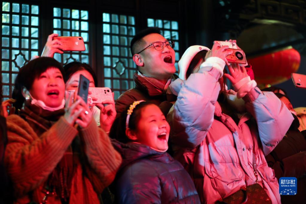 2月4日,市民、游客在浙江省建德市梅城鎮嚴州古城觀看焰火。