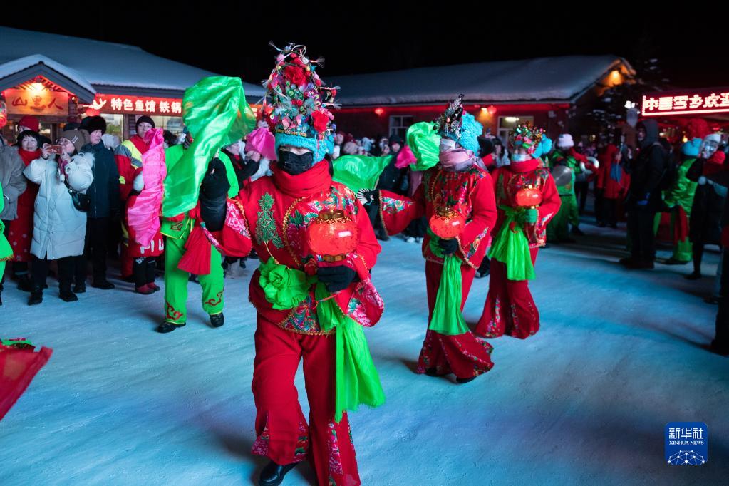 2月4日,秧歌隊在位于黑龍江省牡丹江市的大海林林業局有限公司雙峰林場雪鄉景區內表演。