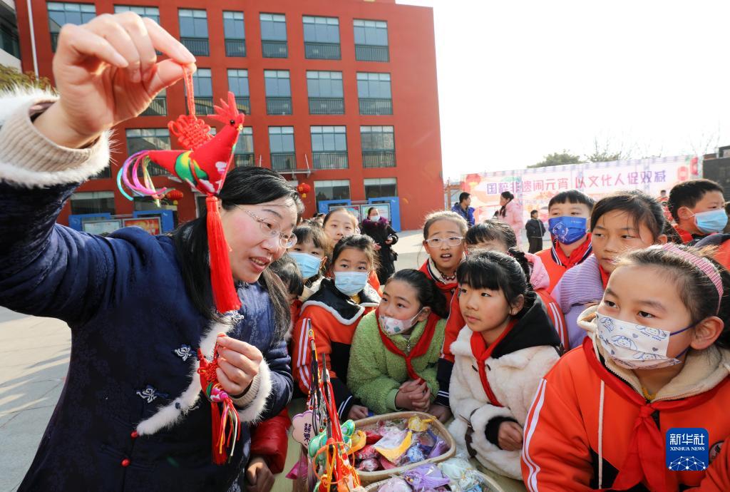 2月4日,在安徽省淮北市濉溪路小學,非遺文化傳人向學生講解立春“春雞”手工香包。