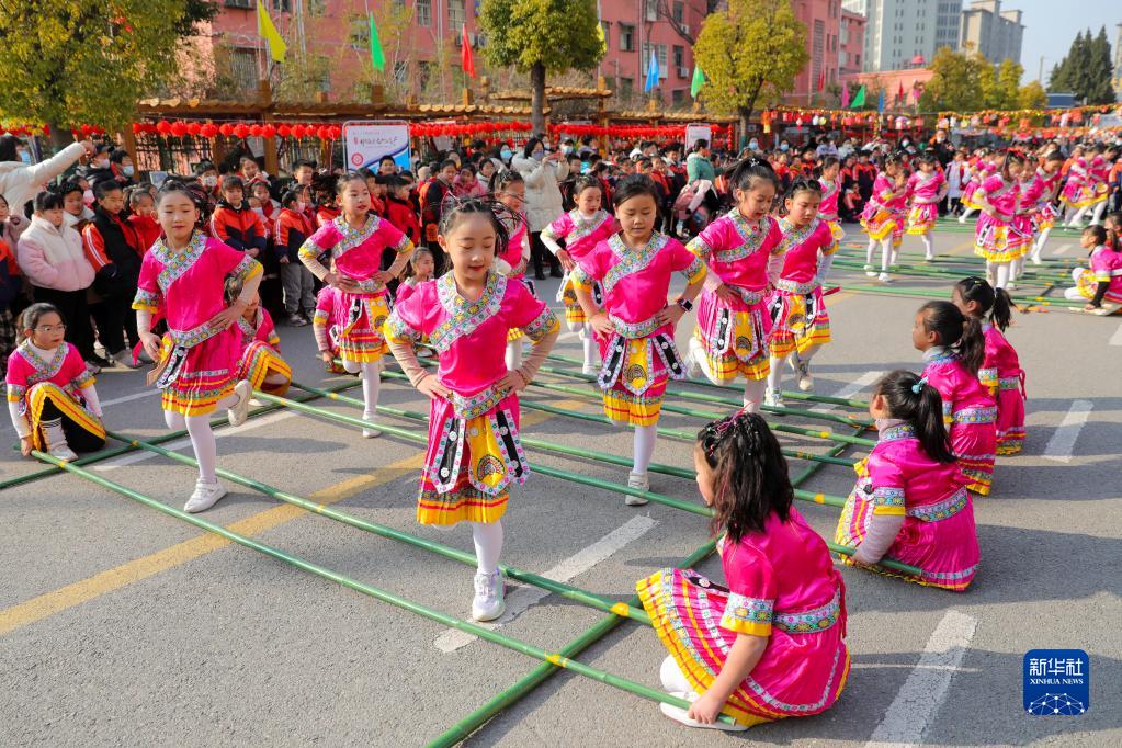 2月4日,安徽省淮北市濉溪路小學的學生們在跳竹竿舞。
