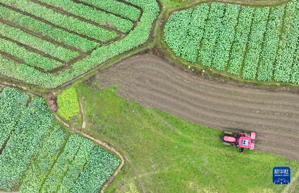 2月4日,在湖南省衡陽市衡東縣楊林鎮寺門前村,農機手駕駛農機在翻耕農田(無人機照片)。