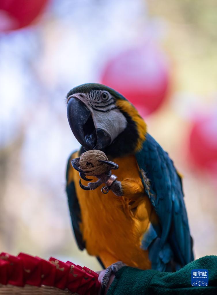 2月4日,云南野生動物園的金剛鸚鵡品嘗堅果。