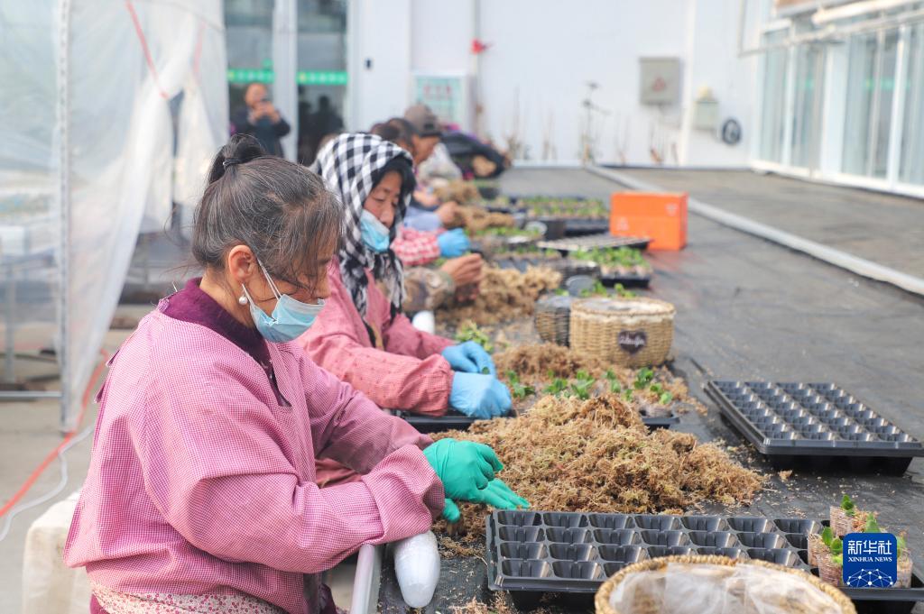 在位于吉林省公主嶺市的恒通生態農業科技開發有限公司種植基地內,員工進行花卉土培轉移工作(1月29日攝)。